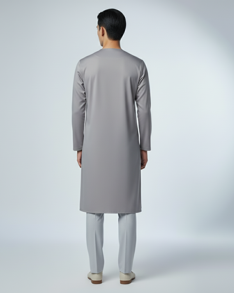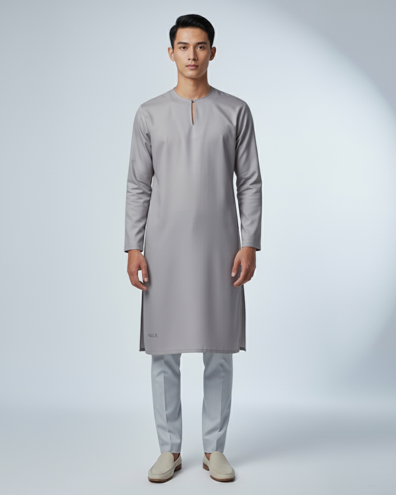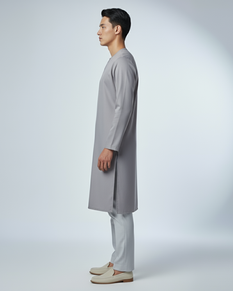 Tailored with a clean Teluk Belanga neckline, open cuff sleeves, and an extended silhouette that lightly covers the hips and upper thighs, this kurta delivers both modesty and modern refinement. Crafted from premium soft matte cotton, the drape flows naturally, enhancing comfort and movement.
