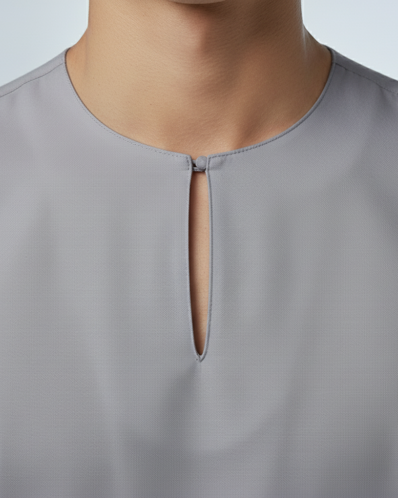 A minimalist extended-length Teluk Belanga kurta crafted for serenity, purity, and Ramadan elegance. Designed with soft matte fabric, open cuffs, and subtle tone-on-tone branding.