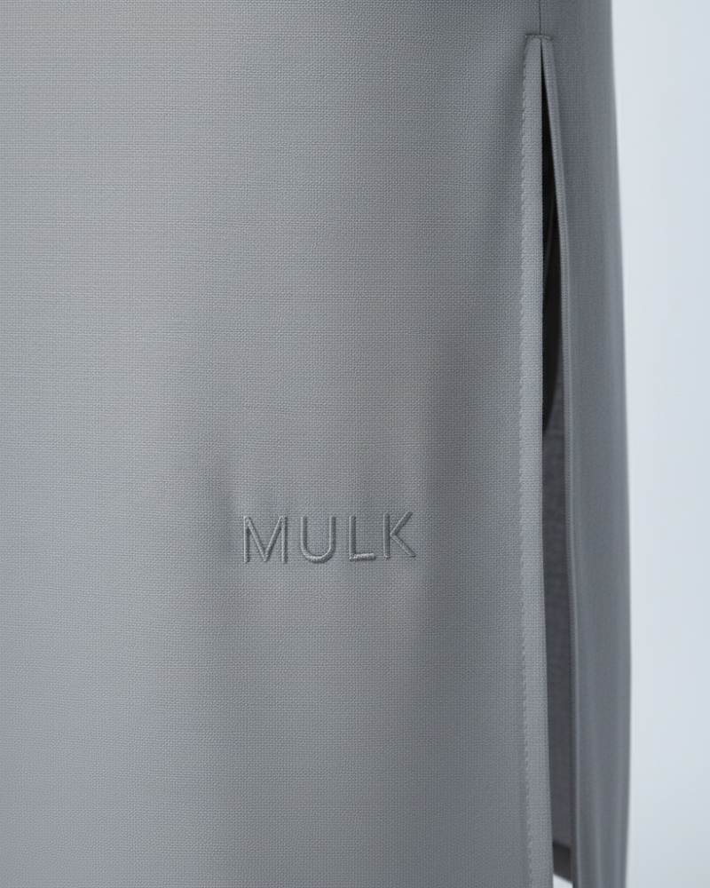 Subtle tone-on-tone “MULK” embroidery reinforces its minimalist luxury, while slim-fit trousers and loafers complete the serene look.