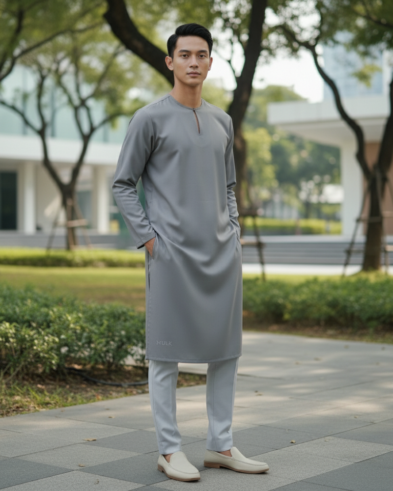 The Qamar Extended-Length Kurta embodies Bersinar Dalam Kesederhanaan — a design philosophy inspired by the calm glow of the moon.