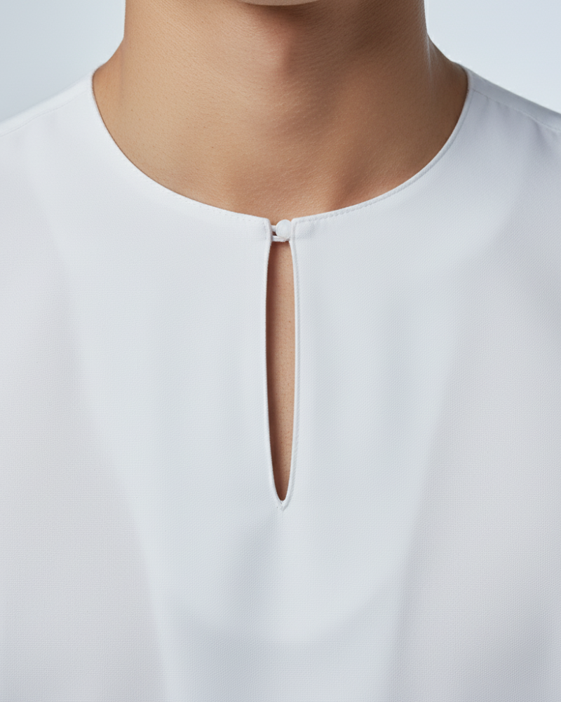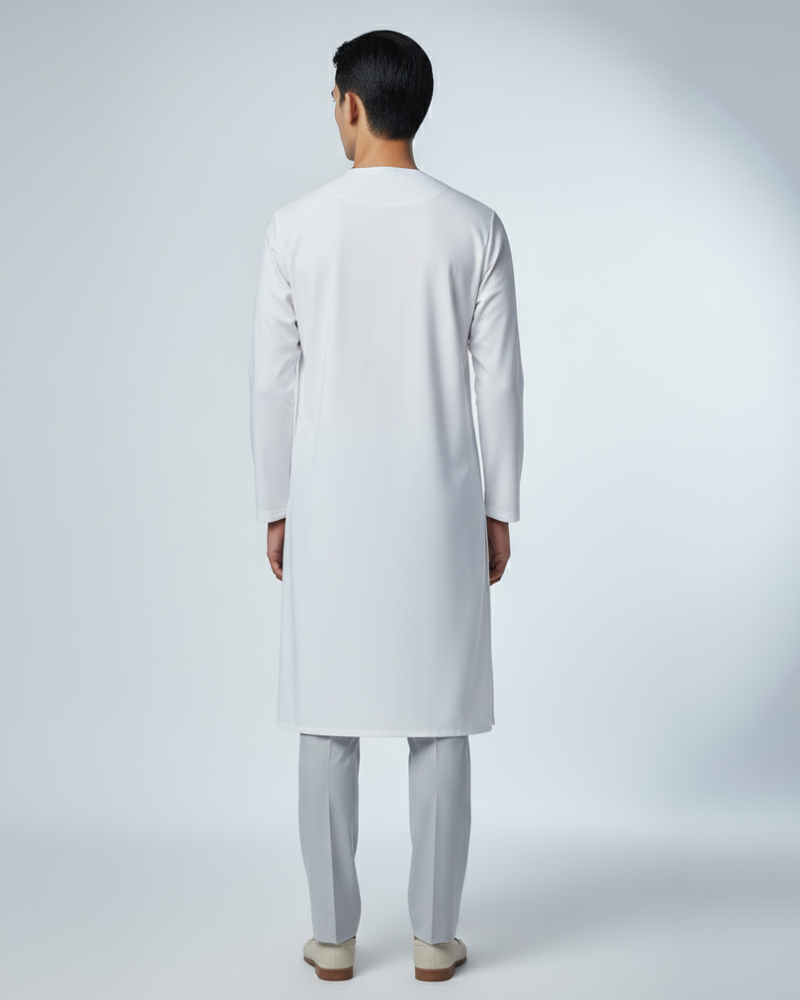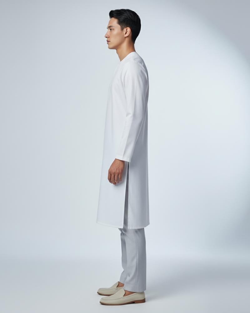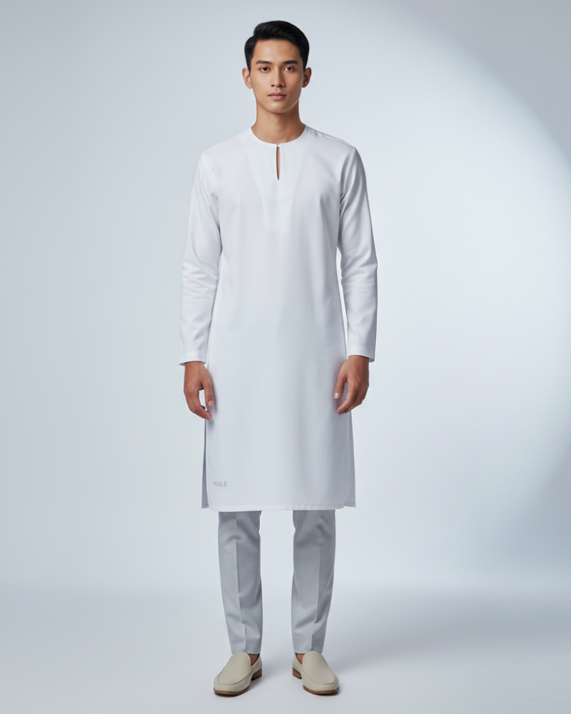 Tailored with a clean Teluk Belanga neckline, open cuff sleeves, and an extended silhouette that lightly covers the hips and upper thighs, this kurta delivers both modesty and modern refinement. Crafted from premium soft matte cotton, the drape flows naturally, enhancing comfort and movement.