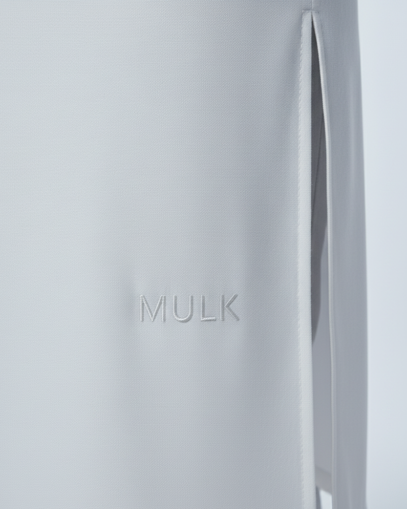 Subtle tone-on-tone “MULK” embroidery reinforces its minimalist luxury, while slim-fit trousers and loafers complete the serene look.