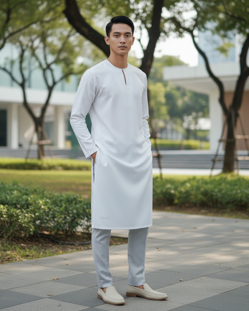 The Qamar Extended-Length Kurta embodies Bersinar Dalam Kesederhanaan — a design philosophy inspired by the calm glow of the moon.